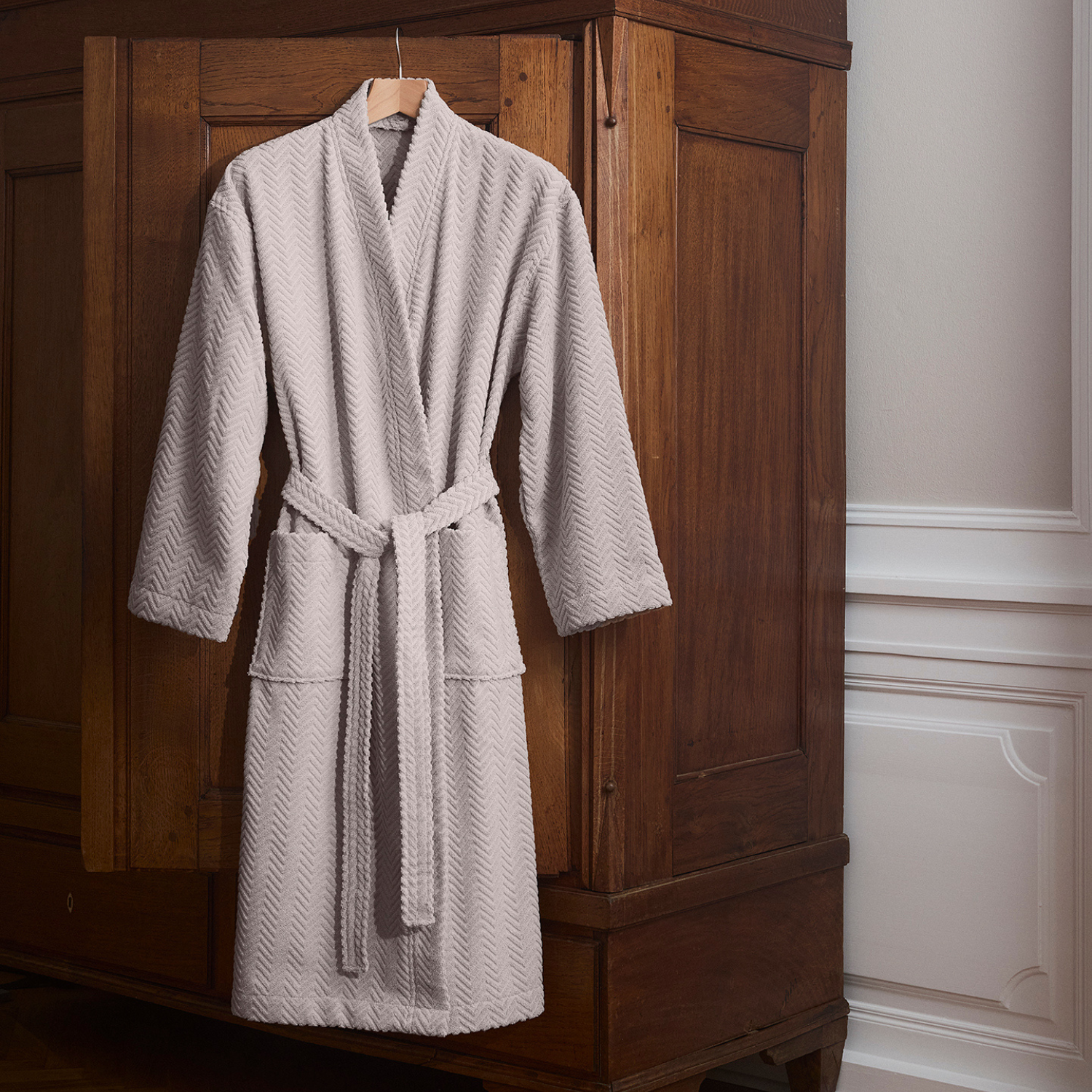 Nogle gaver føles som ren hverdagsluksus. Herringbone badekåben i farven Silver Sand kombinerer klassisk design med en eksklusiv kvalitet, der gør morgener og aftener lidt mere behagelige.
