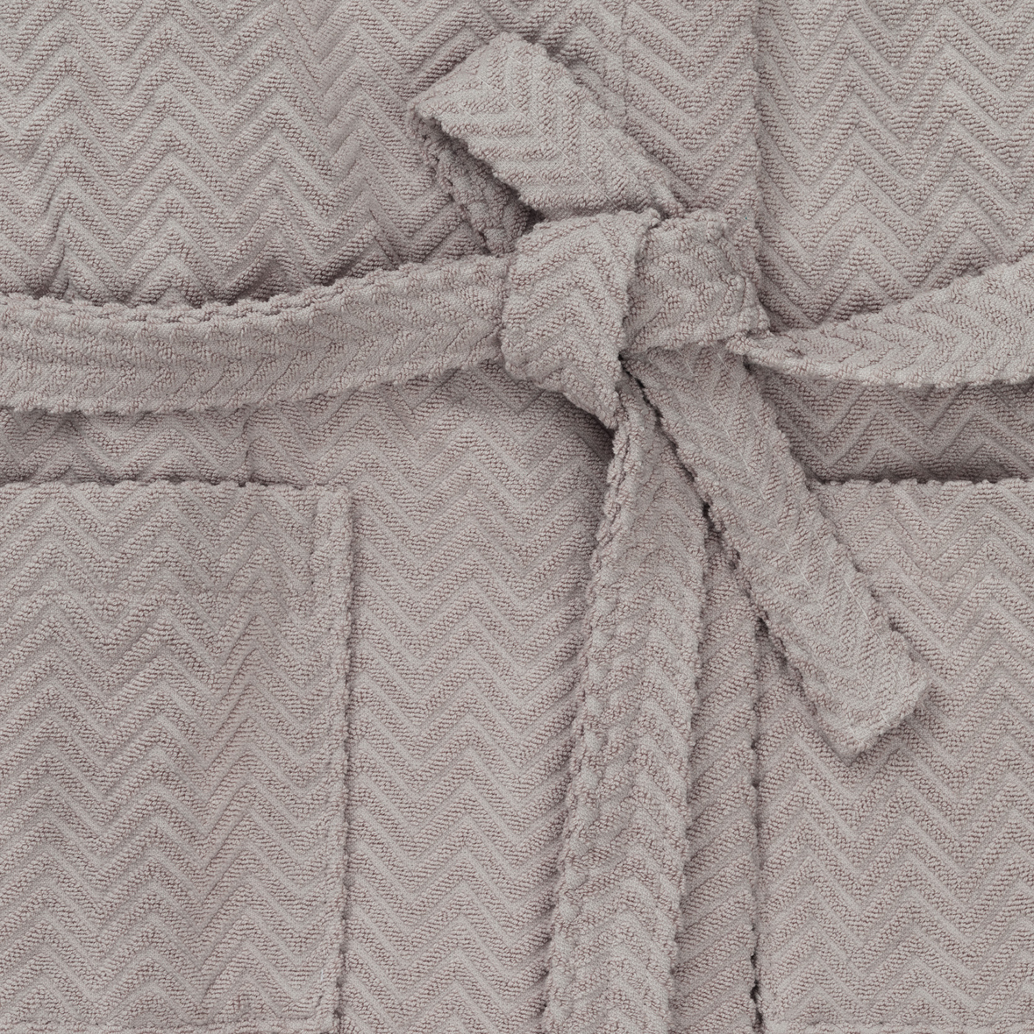 Badekåben er vævet i blød frotté af 100 % bomuld med løkker af dobbelttvundne og kæmmede garner. Den særlige jacquardvævning skaber det elegante sildebensmønster, som giver badekåben et tidløst og stilfuldt udtryk. Designet er unisex og enkelt med bindebånd i taljen og praktiske lommer.
