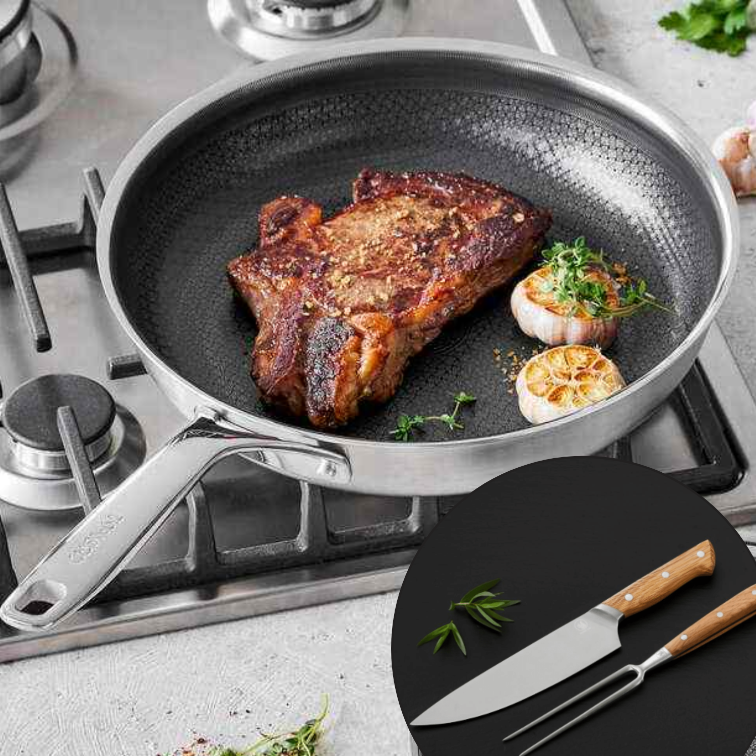 Forskærersættet består af en stegegaffel og en kokkekniv, ideelle til udskæring af stege, fjerkræ og andre lækre retter.
