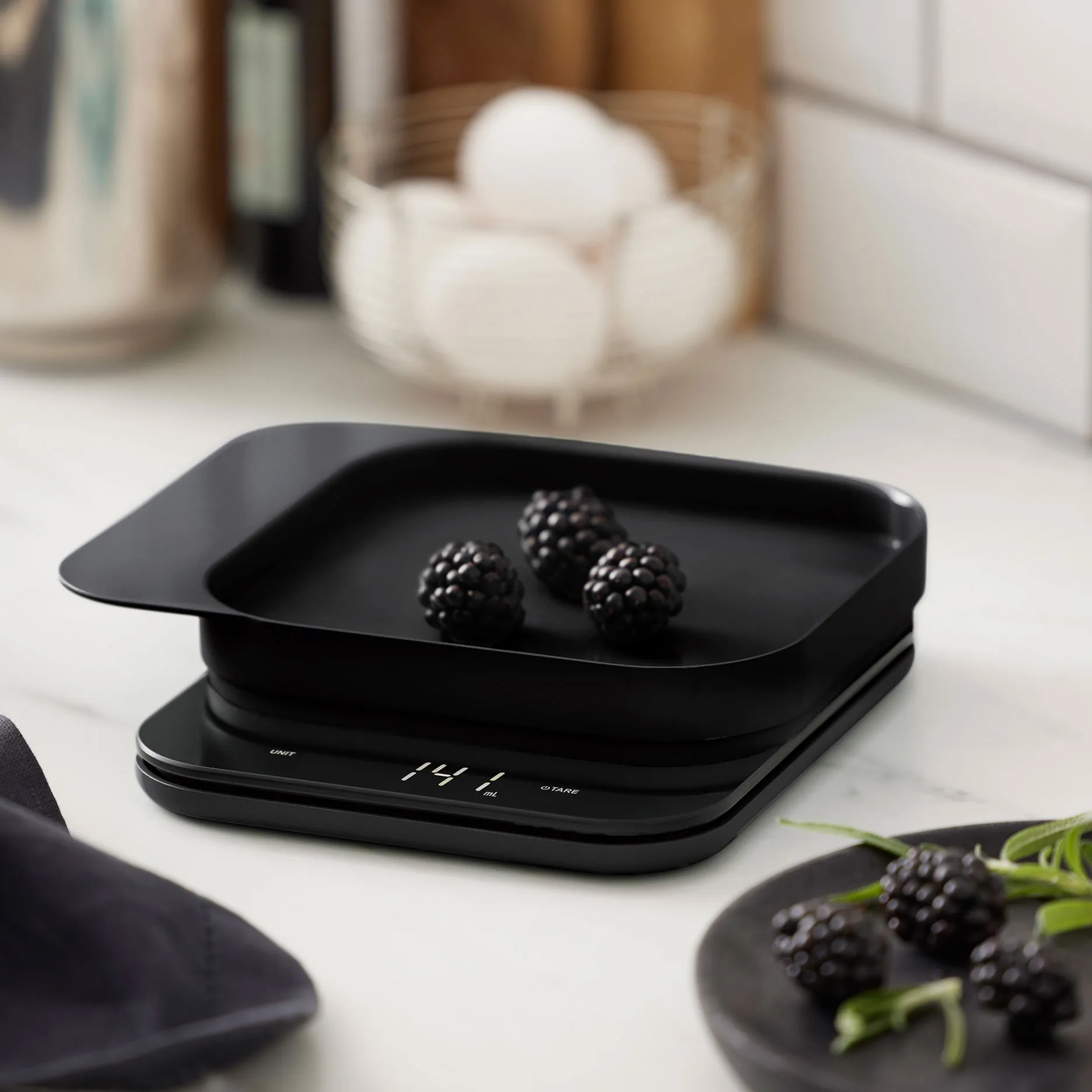 Den smarte tarafunktion gør det nemt at nulstille vægten undervejs, så du kan måle flere ingredienser i samme skål. Skålen er fremstillet i slidstærk ABS og kan også bruges som låg, når vægten ikke er i brug.