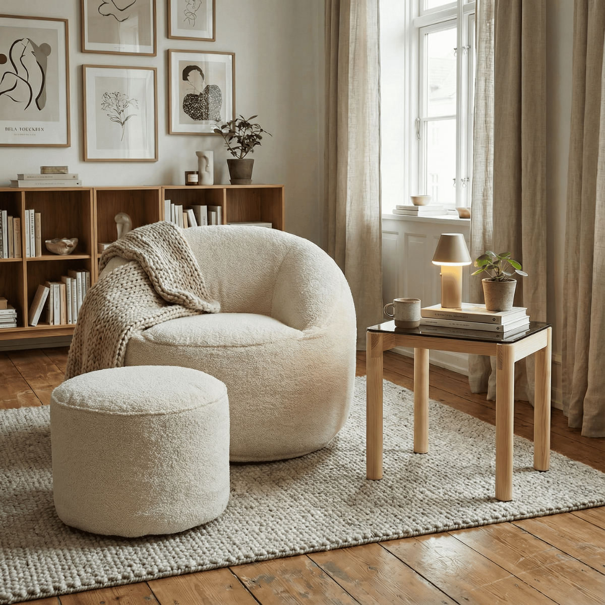 SACKit Nest Chair Indoor med tilhørende Nest Pouf Indoor er skabt til ren afslapning – et gennemført loungesæt, hvor komfort og design går hånd i hånd.