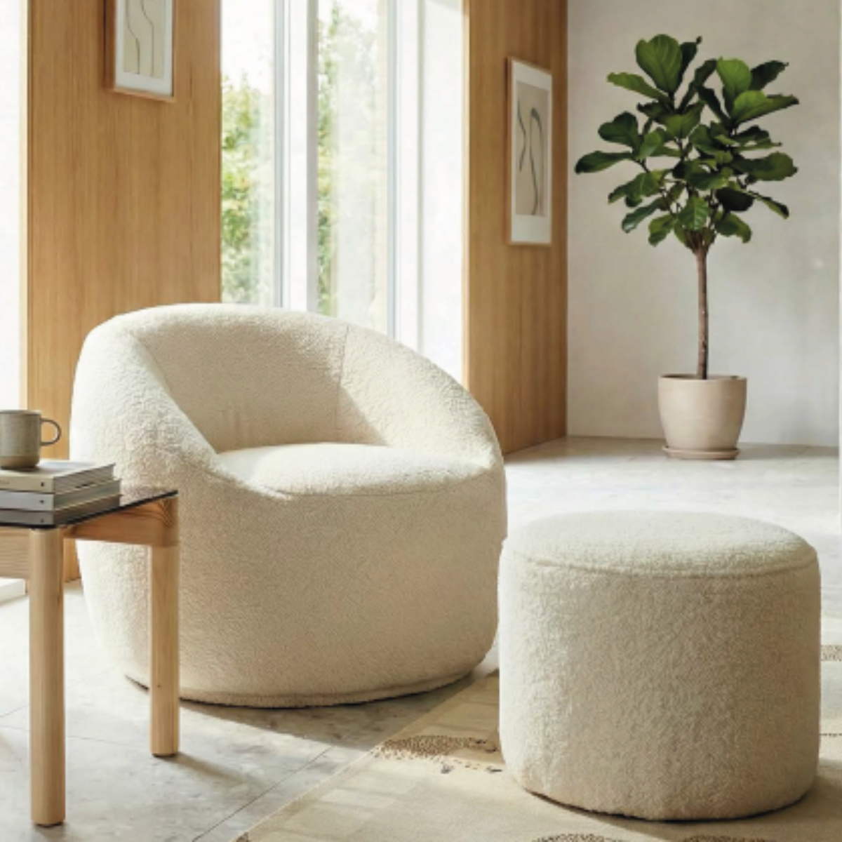 Stolen har et indbydende og organisk formsprog, der inviterer til ro og fordybelse. Det bløde Soft Teddy-tekstil tilfører varme og en sanselig tekstur, som gør stolen til et naturligt samlingspunkt i hjemmet. Den formstabile polstring i koldskum sikrer, at stolen bevarer sin komfort og støtte – også ved daglig brug.