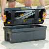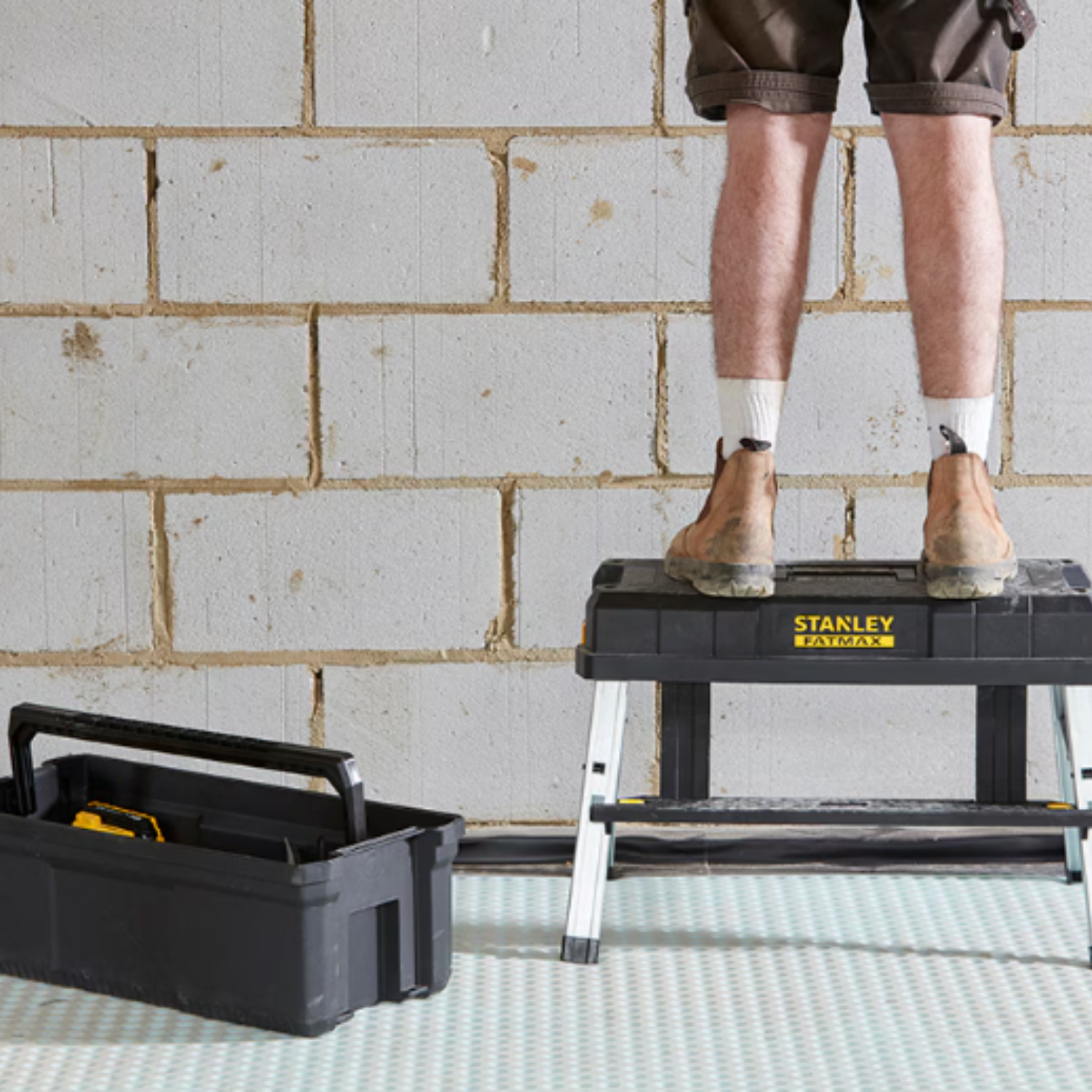 - STANLEY® FATMAX® 25″ STEP STOOL VÆRKTØJSKASSE giver en 3-i-1 løsning med værktøjskasse, taburet og åben værktøjskasse