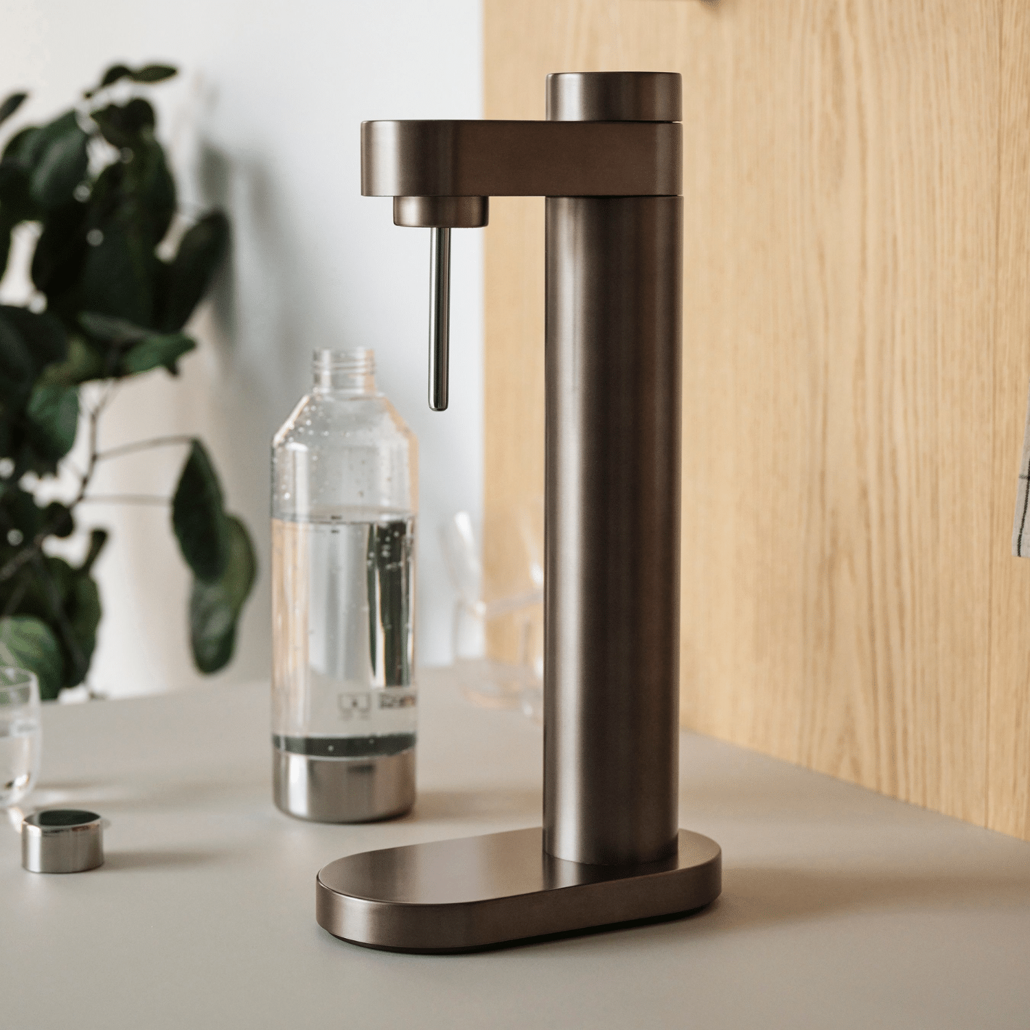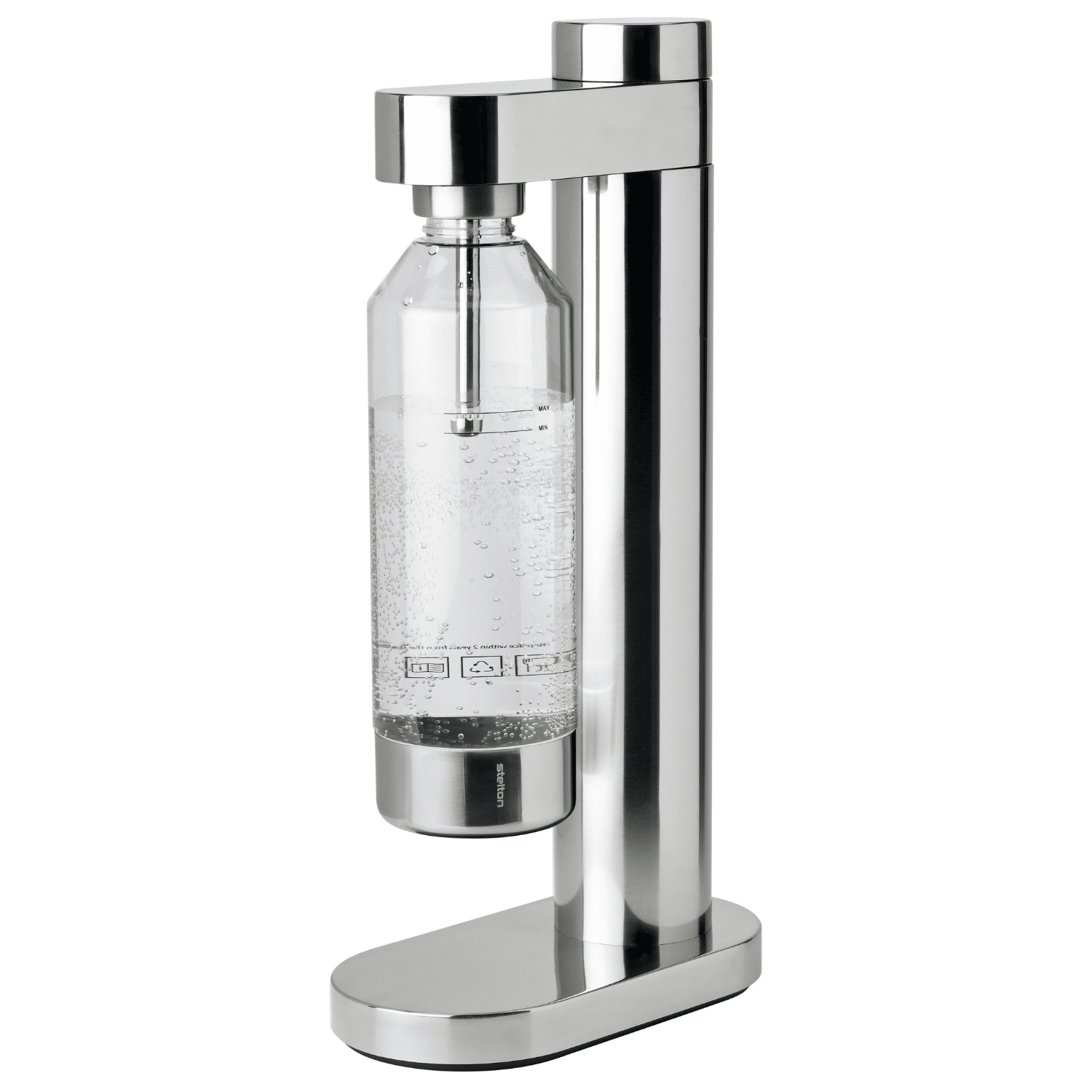 Steltons klassiske designarv. Den intuitive kulsyreknap giver dig fuld kontrol: Drej med uret for at tilsætte kulsyre – og mod uret for at frigøre flasken.