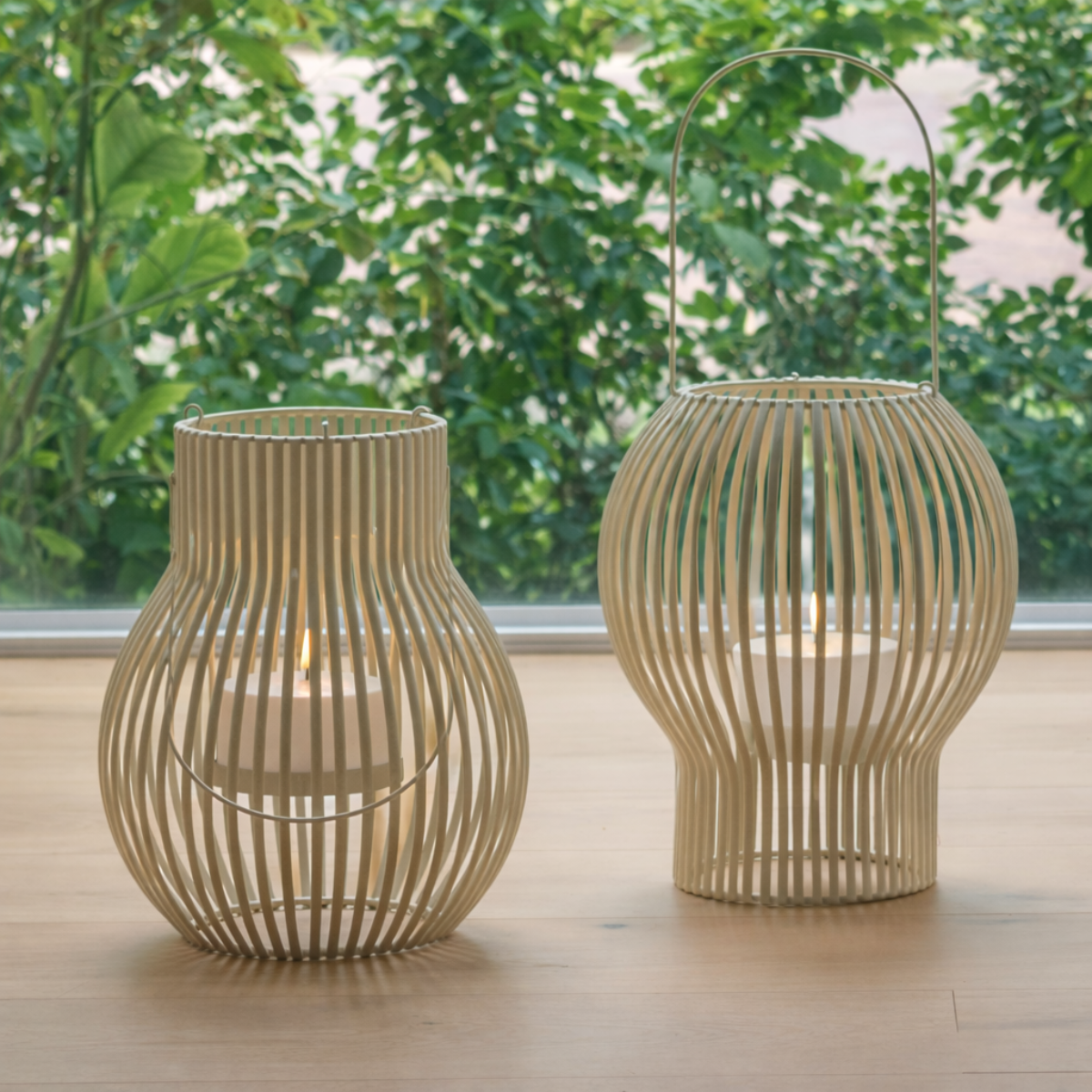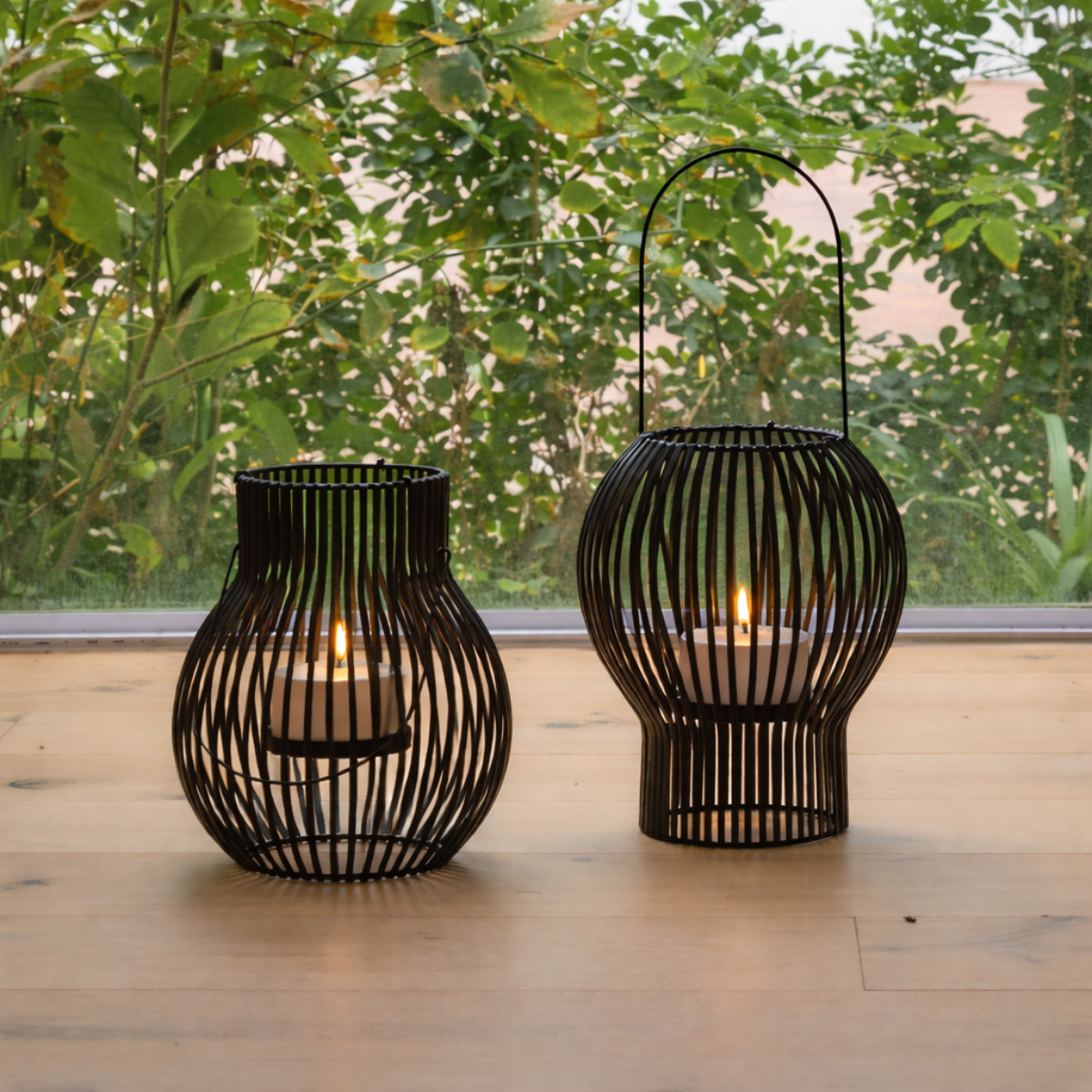 De to Upside Down lanterner i medium størrelse giver et markant og stilrent udtryk, der passer perfekt til både terrasse, altan og indendørs indretning.